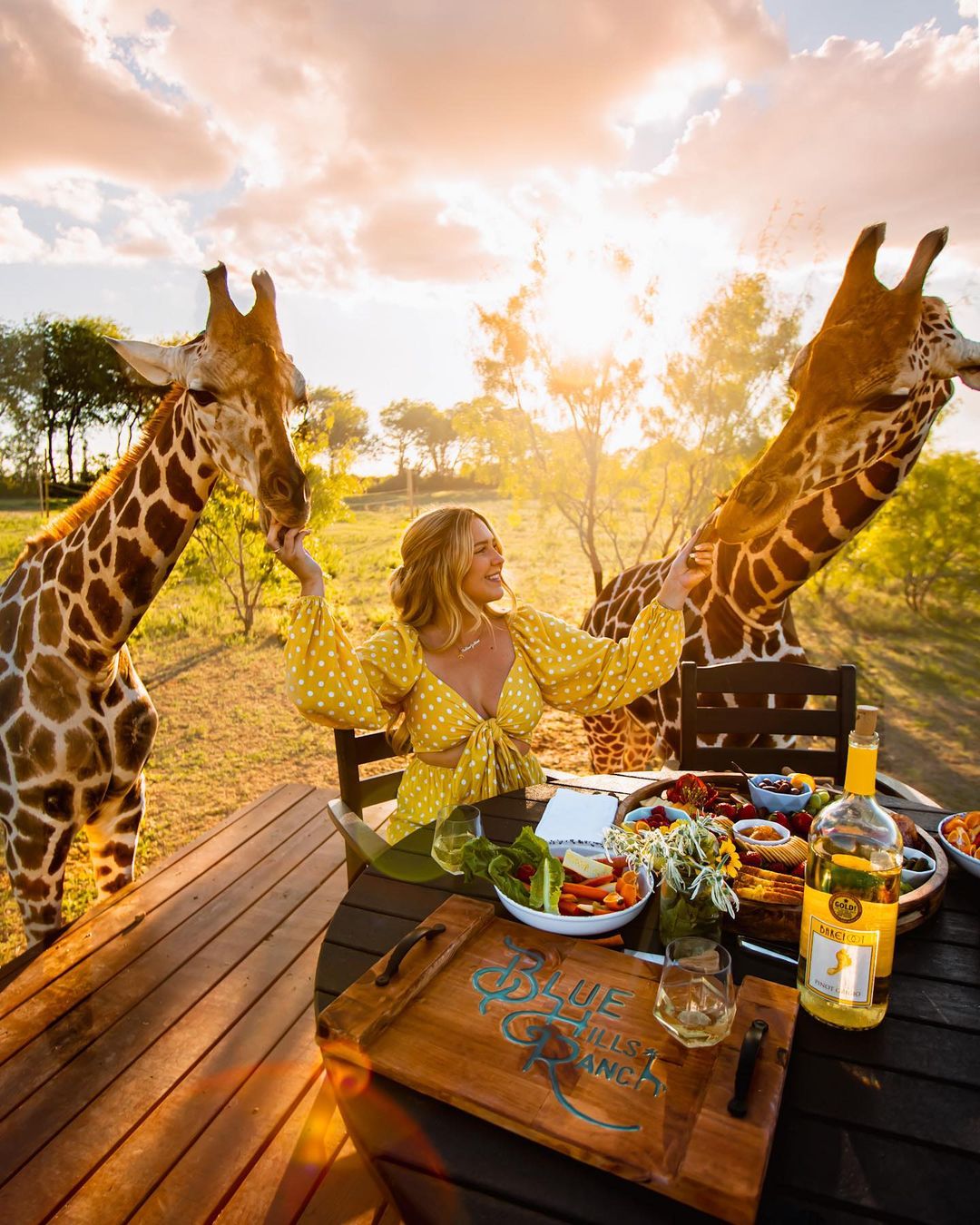 Dining with Giraffes: A once-in-a-lifetime experience where you dine alongside the ranch's tallest friends, with a charcuterie board, dessert, and your choice of drink.