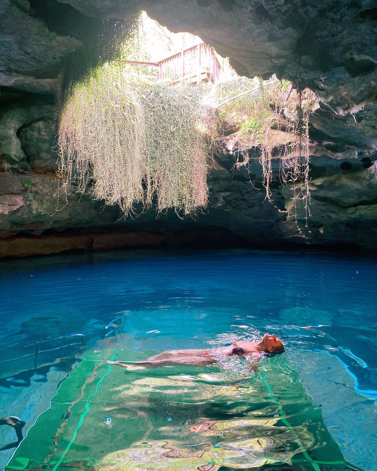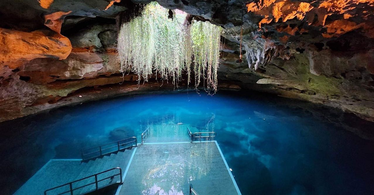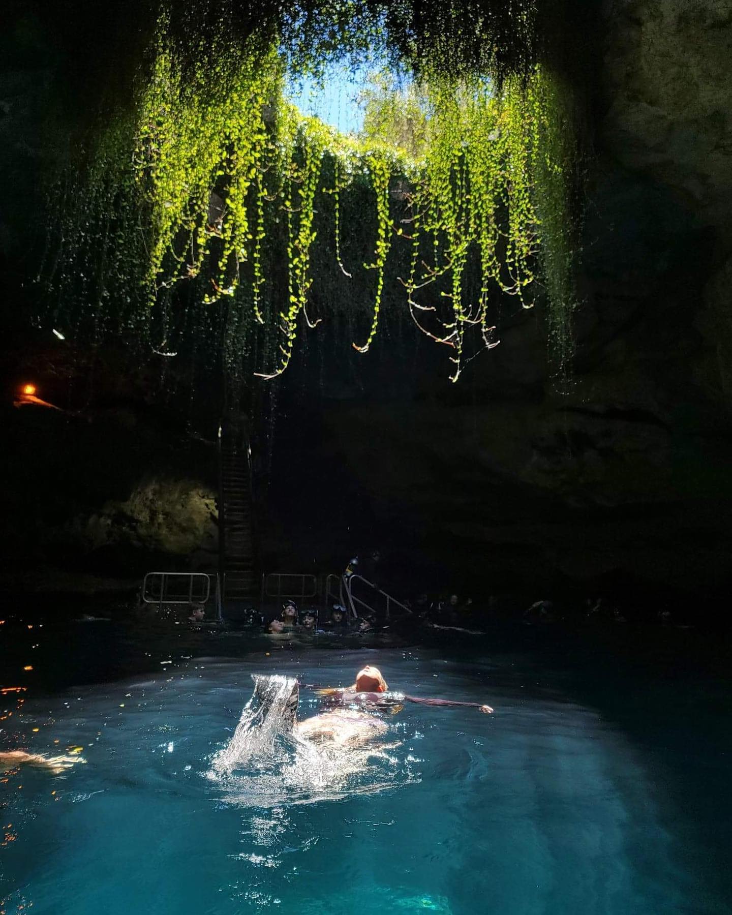 Immerse yourself in the crystal-clear waters of a prehistoric spring, surrounded by ancient rock formations.