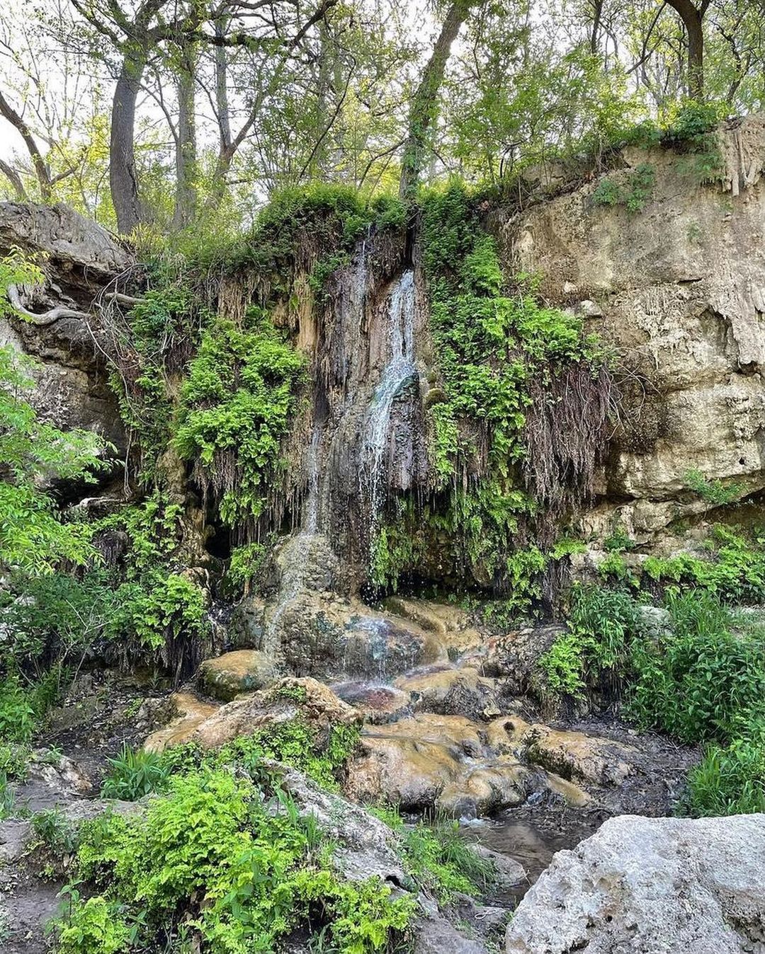 Krause Springs is a large property with 32 natural springs to swim in, including man-made pools and a natural pool flowing into Lake Travis. Located in Spicewood, Texas, it offers visitors a chance to swim, hike, and explore a butterfly garden and grotto. The park is kid-friendly with various pool depths, a rope swing, and a waterfall. Camping options are available, and it is open daily from 9 a.m. to 8 p.m.