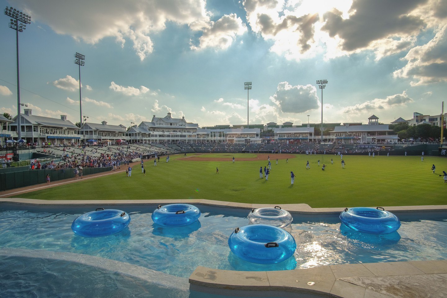 Dive into summer with the Frisco RoughRiders. Enjoy baseball from a lazy river for a unique, cool game-viewing experience. Beat the summer heat with a splash and a game, watching the Frisco RoughRiders from a lazy river, featuring special Thursday and Sunday events. At Riders Field in Frisco, Texas, the unique blend of baseball and leisure comes to life where the Frisco RoughRiders' games can be enjoyed from the comfort of a lazy river, offering an unparalleled 360-degree view of the action from an elevated spot above right field. Since its opening in 2016, this has become a signature summer experience, with Thursday nights catering to adults through the Blue Norther Hard Seltzer Rowdy At The River event, featuring live music, $2 drinks, and exclusive bar access, while Sundays open up for family fun, welcoming all ages to enjoy the game amidst the cool waters. Located across from IKEA, Riders Field merges the excitement of minor league baseball with the relaxation of a lazy river, creating an unforgettable outing for sports fans, families, and anyone looking to beat the Texas heat in a memorable way.
