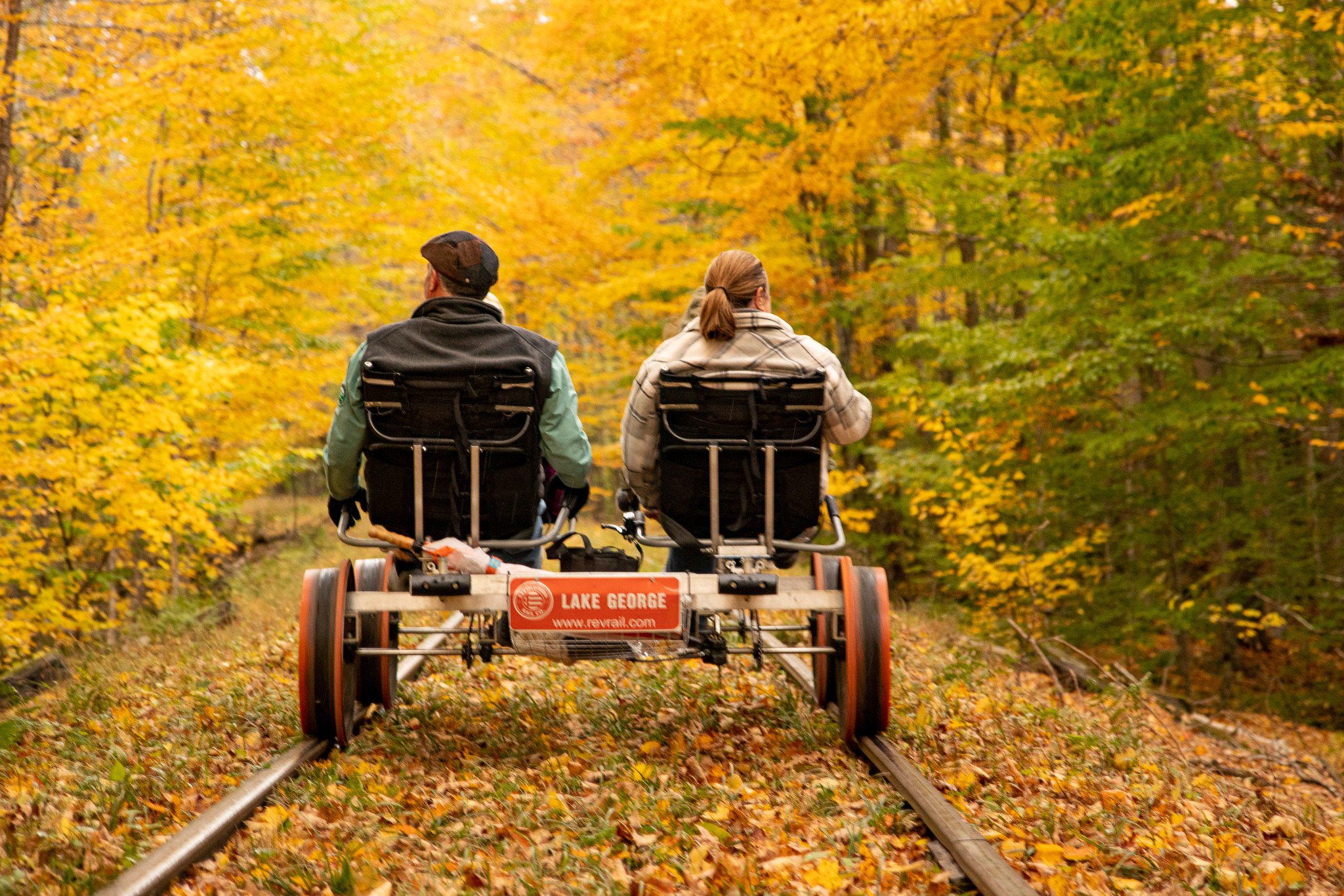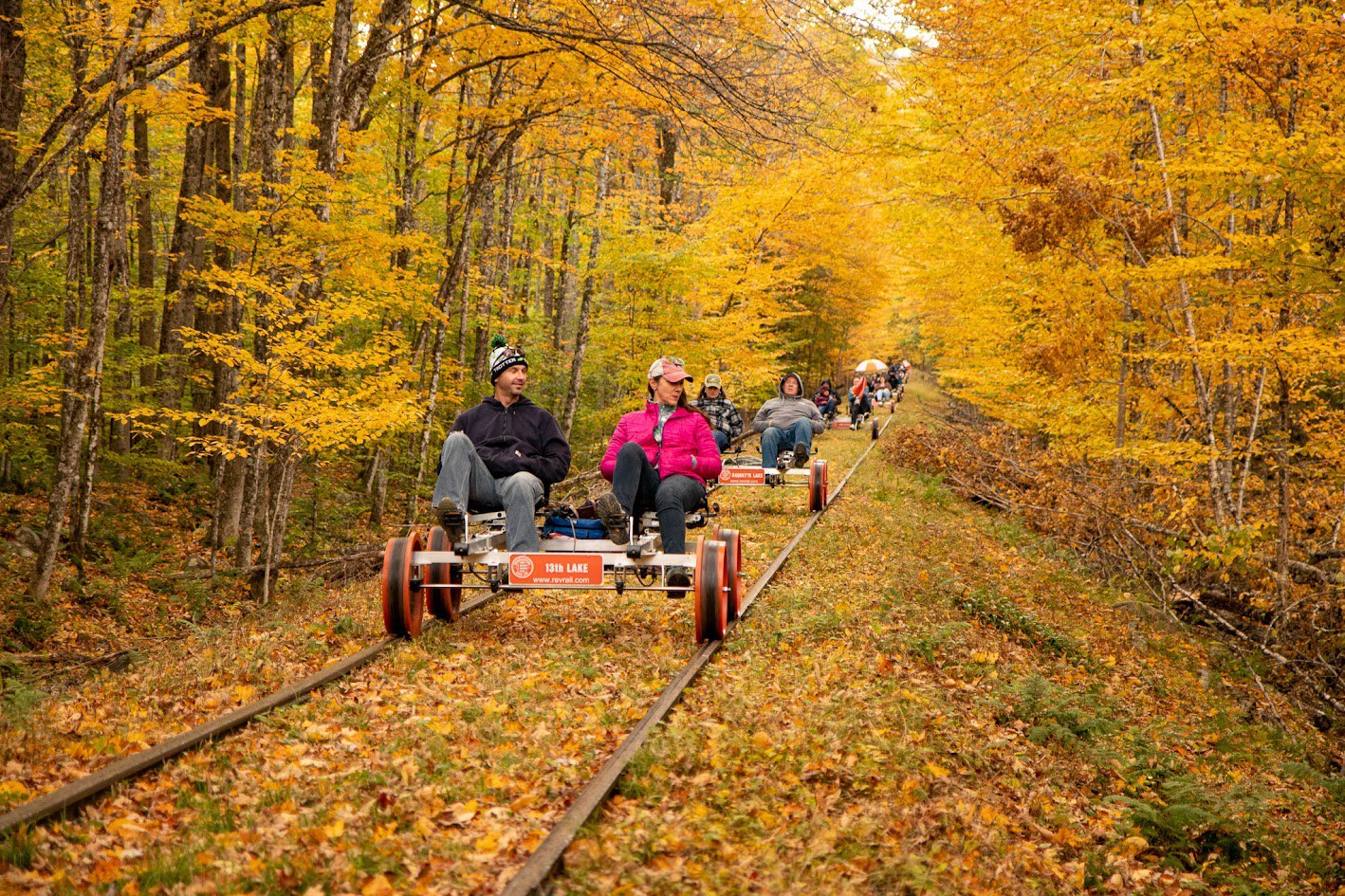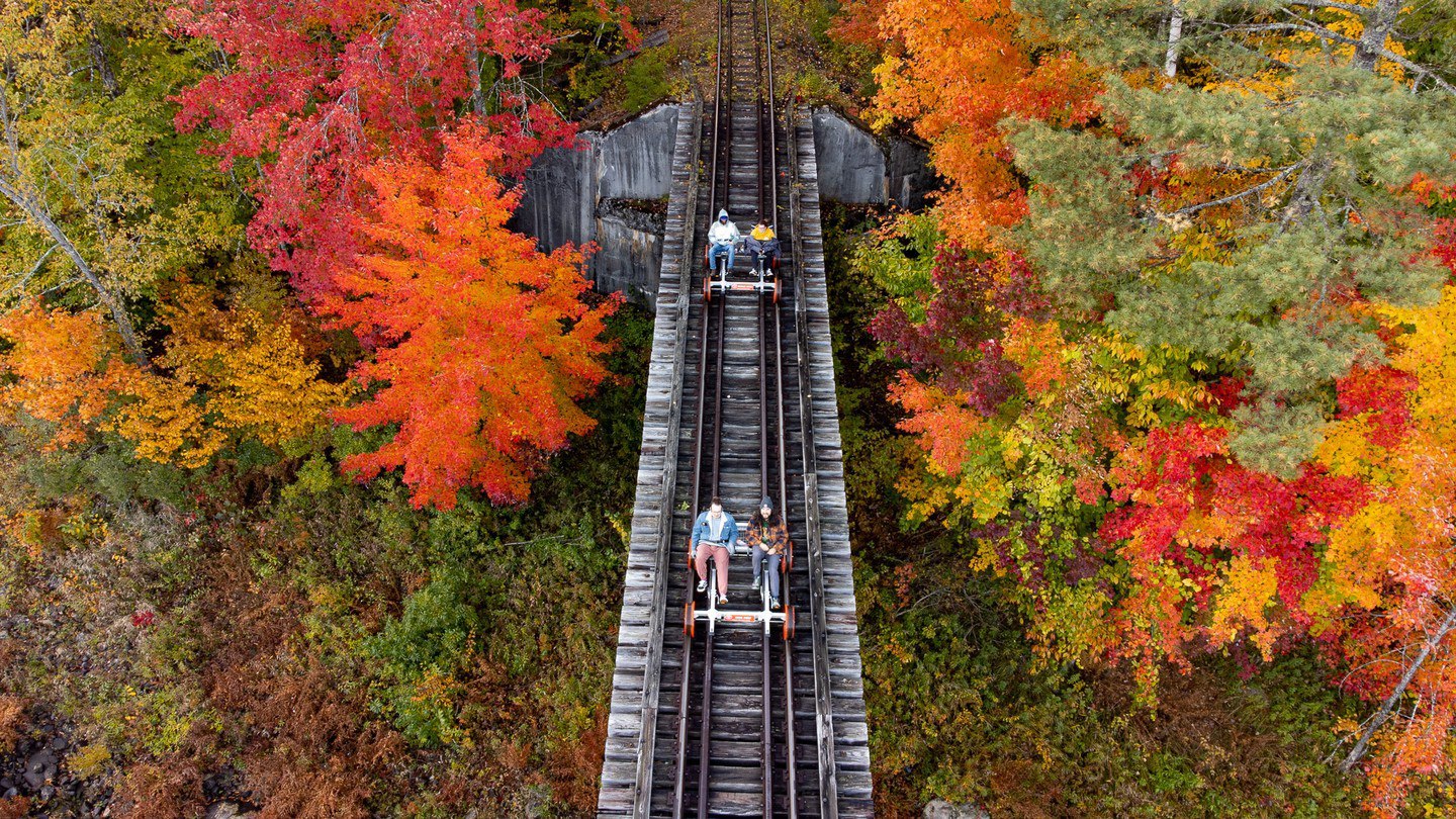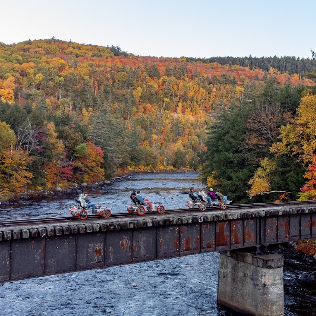 Discover the serene beauty of the Adirondacks by railbike, journeying through dense forests and over the Hudson River for an unforgettable experience.