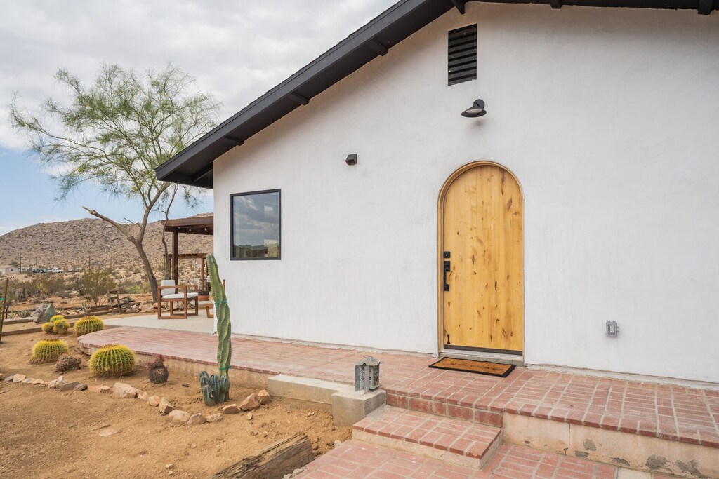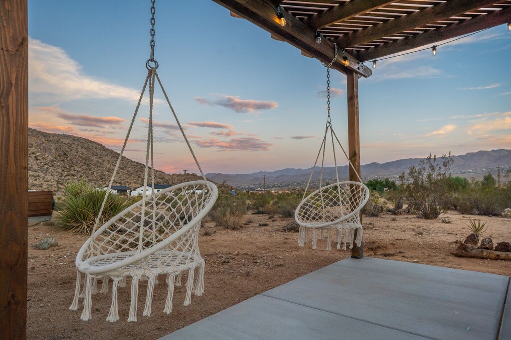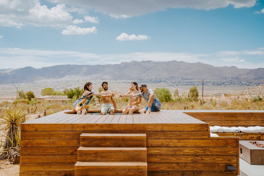 Escape to Casa Coyotes, a thoughtfully designed vacation rental in Joshua Tree, California, offering a serene desert getaway. This stylish and modern home features 2 bedrooms, 2 bathrooms, a fully equipped kitchen, and spacious living areas with full-length windows to showcase the stunning desert landscape. Enjoy breathtaking sunsets and starry skies while relaxing in the private hot tub, or soak in the seasonal cowboy pool after a day of exploring. The outdoor patio area features a BBQ, propane fire pit, and hammocks, providing the perfect setting for memorable gatherings with friends and family.