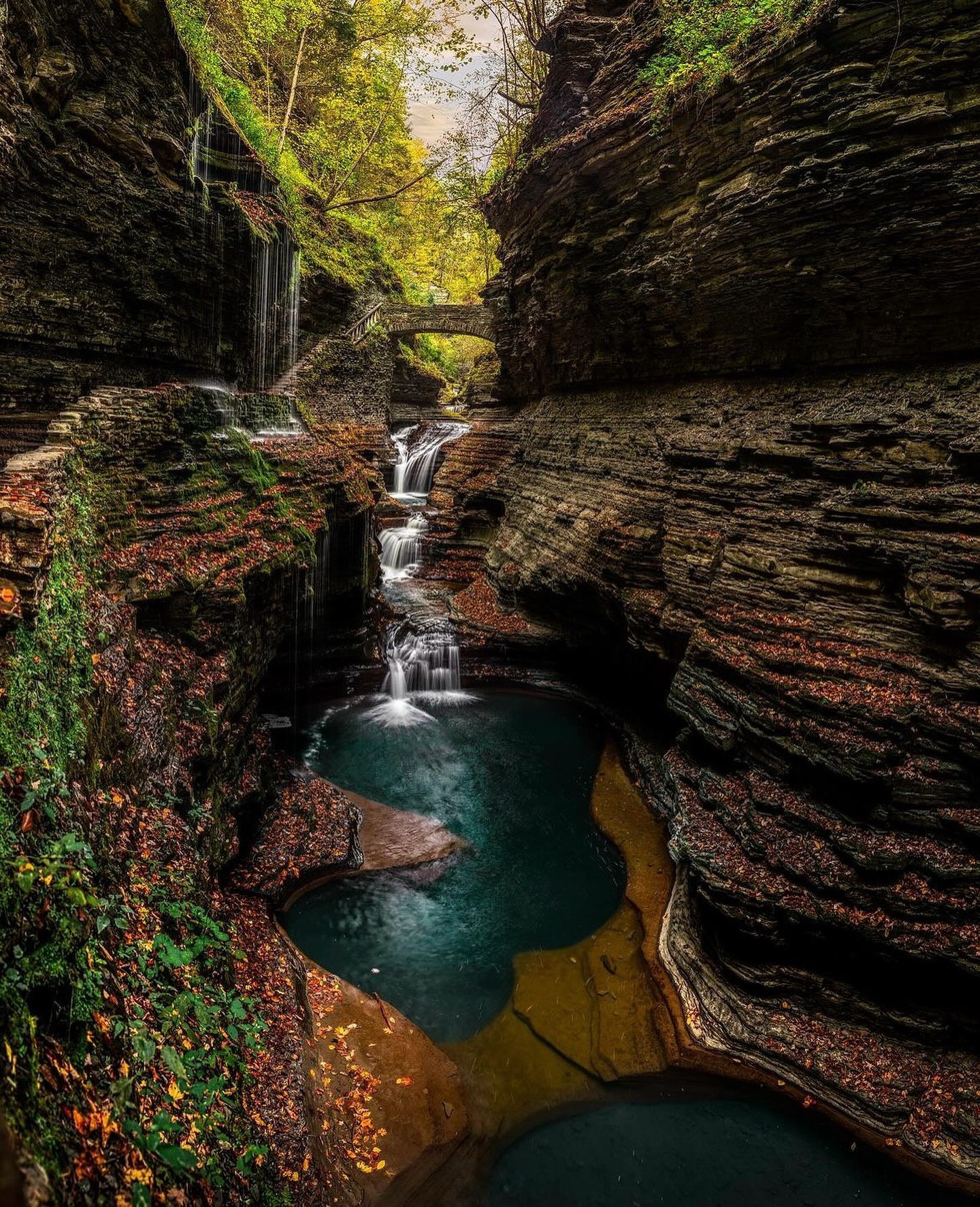 The Watkins Glen Gorge Trail offers an unforgettable experience, winding through a deep chasm carved over thousands of years. Starting at the Main Entrance, visitors will ascend the stone steps, passing under Rainbow Bridge to witness the first of many waterfalls. The trail continues through the gorge, with each turn presenting a new, stunning cascade. Highlights include the Cavern Cascade and Rainbow Falls, with strategic viewpoints and bridges offering perfect photo opportunities. The experience concludes at the Upper Entrance, where visitors can rest and reflect on the journey through this geological masterpiece.